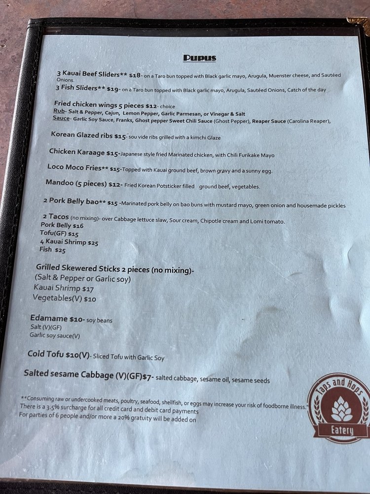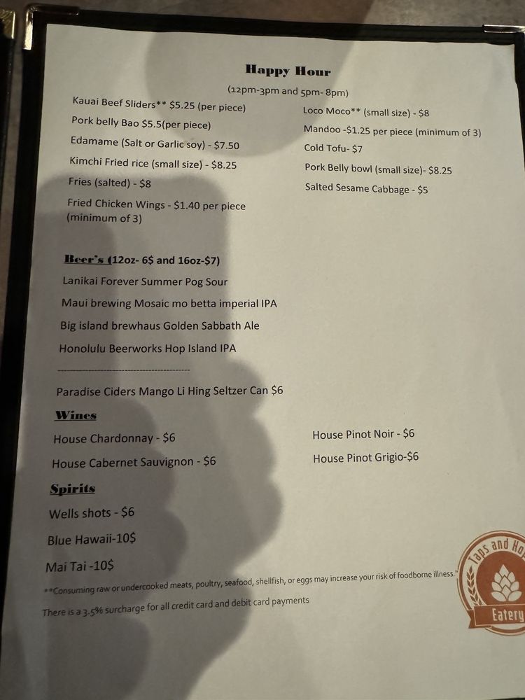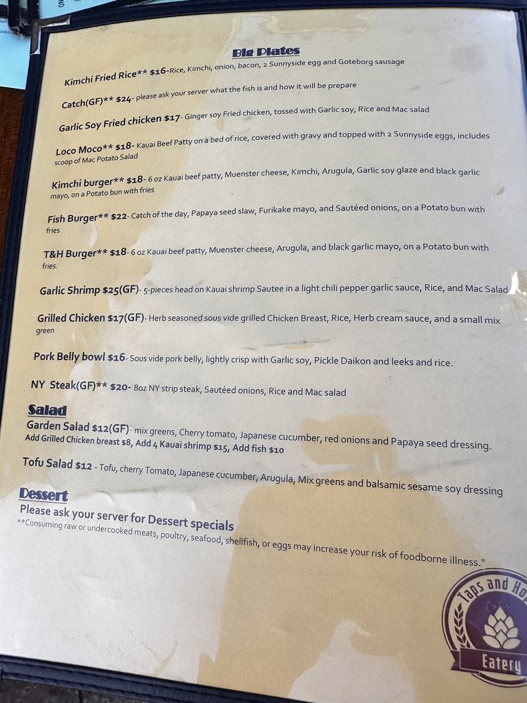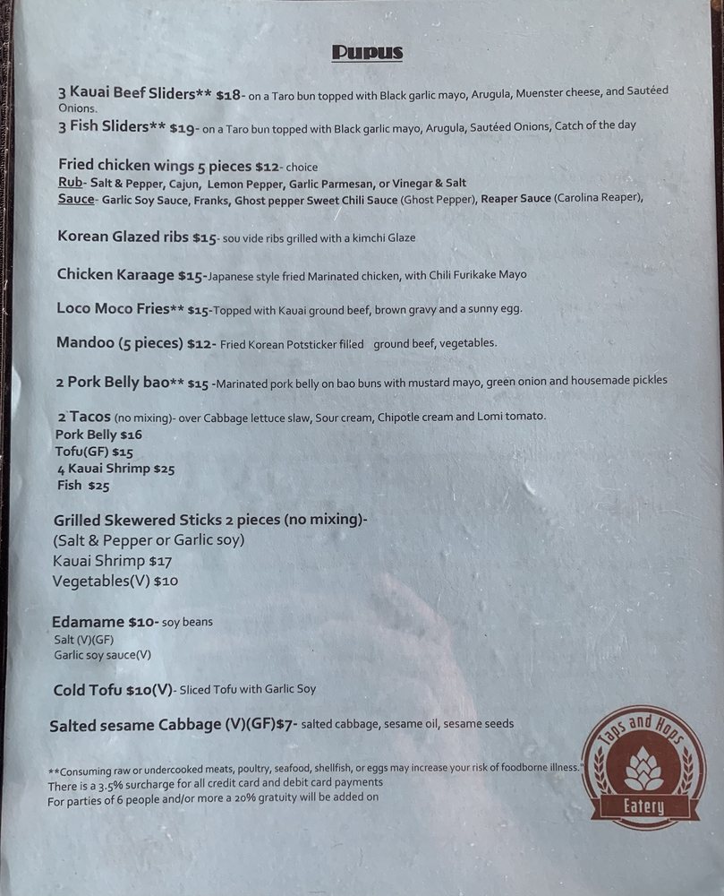 Introducing Taps and Hops Eatery, a bustling gastropub located at 4-885 Kuhio Hwy in Kapa'a, HI. This eatery offers a range of amenities like outdoor seating, free Wi-Fi, and a happy hour with great beer and wine selections. Customers rave about the friendly staff and top-notch service, along with the delectable dishes like the Manoo, Kimchee Fried Rice, soft shell crab, and pork belly bao. The extensive drink menu includes local whiskey, Old Pali Road, and the refreshing coconut mule. With ample parking and a vibrant atmosphere, Taps and Hops is a must-visit destination for both locals and tourists. Join in on the excitement and indulge in the flavors that this gem of a restaurant has to offer.