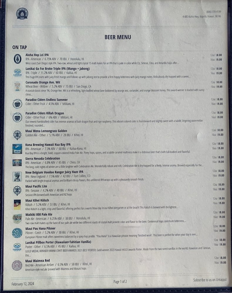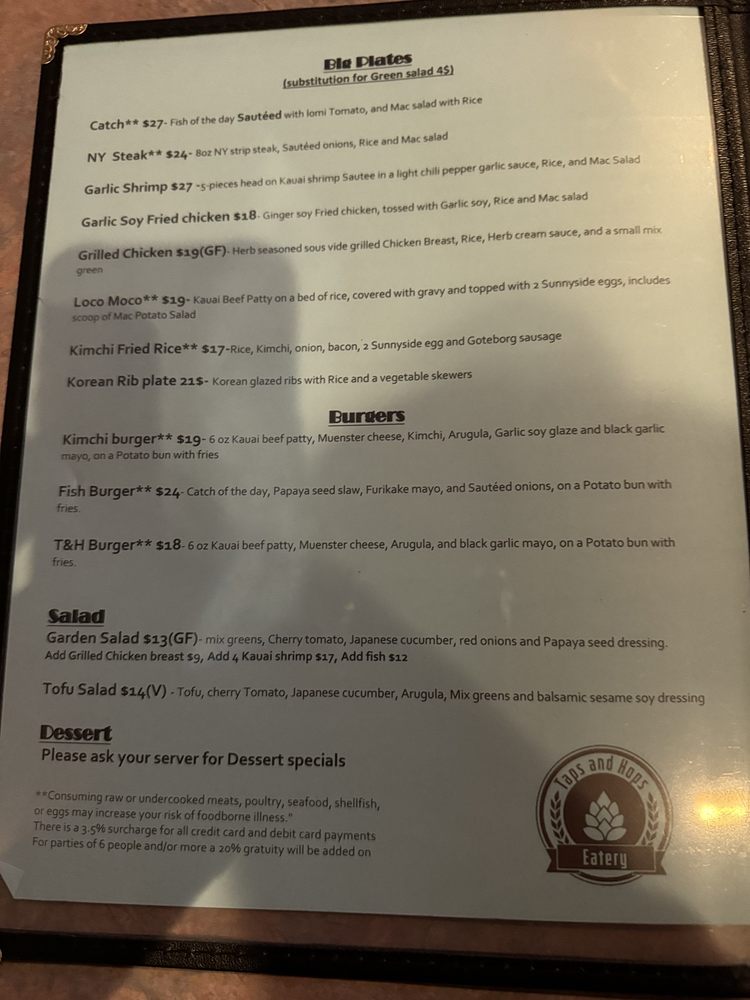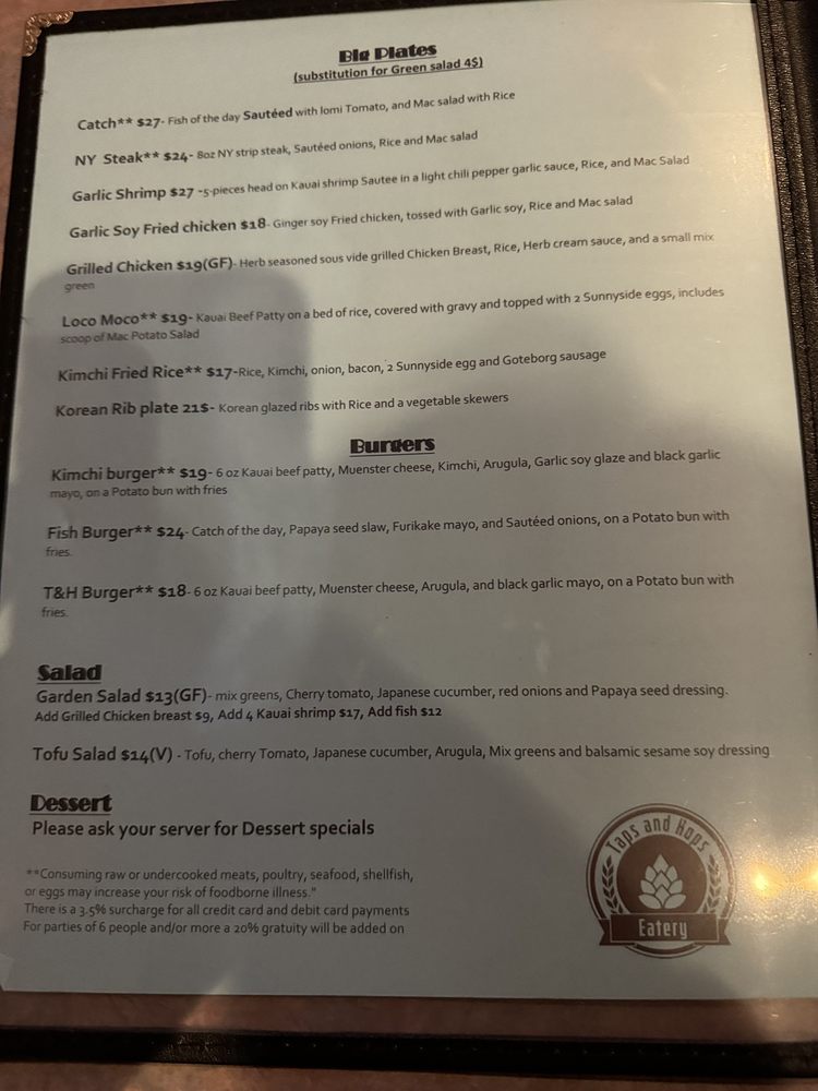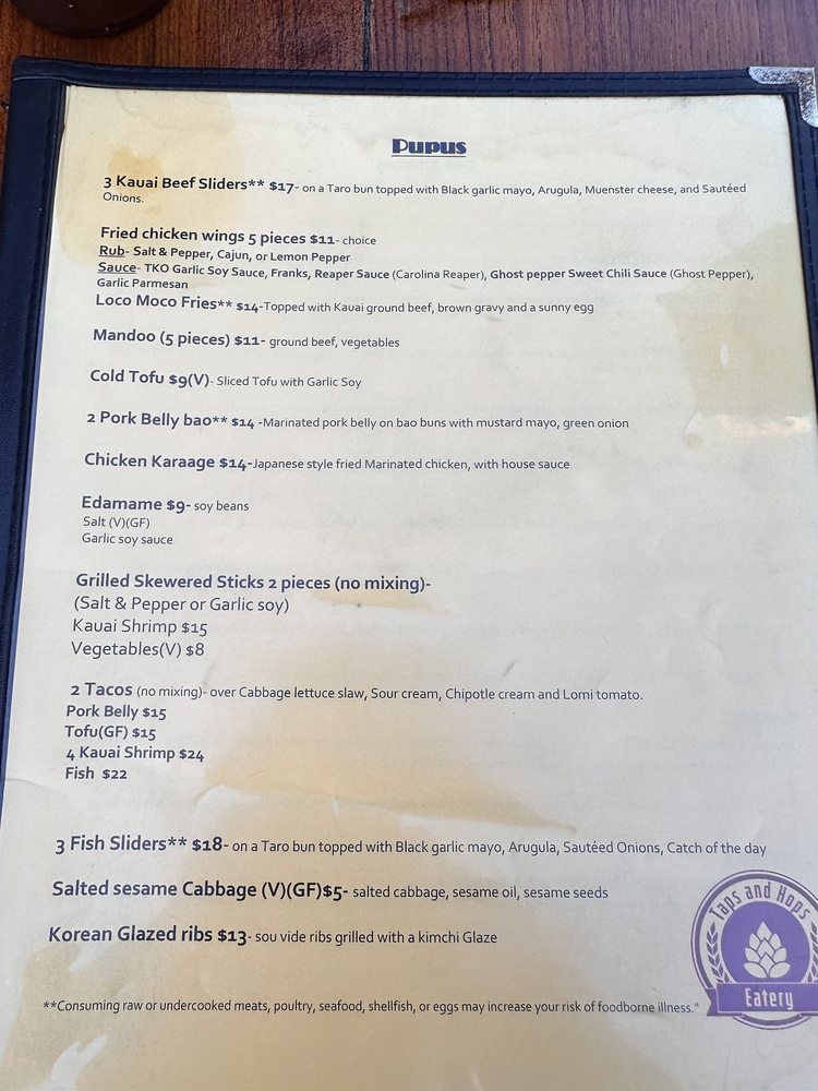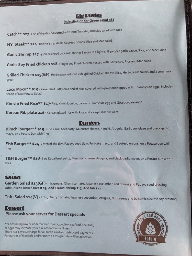 Introducing Taps and Hops Eatery, a bustling gastropub located at 4-885 Kuhio Hwy in Kapa'a, HI. This eatery offers a range of amenities like outdoor seating, free Wi-Fi, and a happy hour with great beer and wine selections. Customers rave about the friendly staff and top-notch service, along with the delectable dishes like the Manoo, Kimchee Fried Rice, soft shell crab, and pork belly bao. The extensive drink menu includes local whiskey, Old Pali Road, and the refreshing coconut mule. With ample parking and a vibrant atmosphere, Taps and Hops is a must-visit destination for both locals and tourists. Join in on the excitement and indulge in the flavors that this gem of a restaurant has to offer.